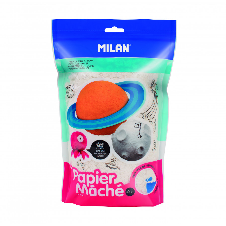Pâte de papier mâché en poudre, très souple et de couleur blanche. Sèche à l'air (temps de séchage approximatif : à partir de 48h, selon l'épaisseur et les conditions de l'environnement). Mode d'emploi : mélanger 3 volumes de poudre dans 1 volume d'eau jusqu'à obtenir une pâte homogène. Appliquer la pâte sur la surface avec une épaisseur d'environ 2 à 3 mm et couvrir de manière uniforme sans laisser de trous ni de bulles. Une fois sec, on peut le peindre avec de la gouache ou de la peinture acrylique et décorer avec d'autres éléments comme des cartons ou adhésifs.
