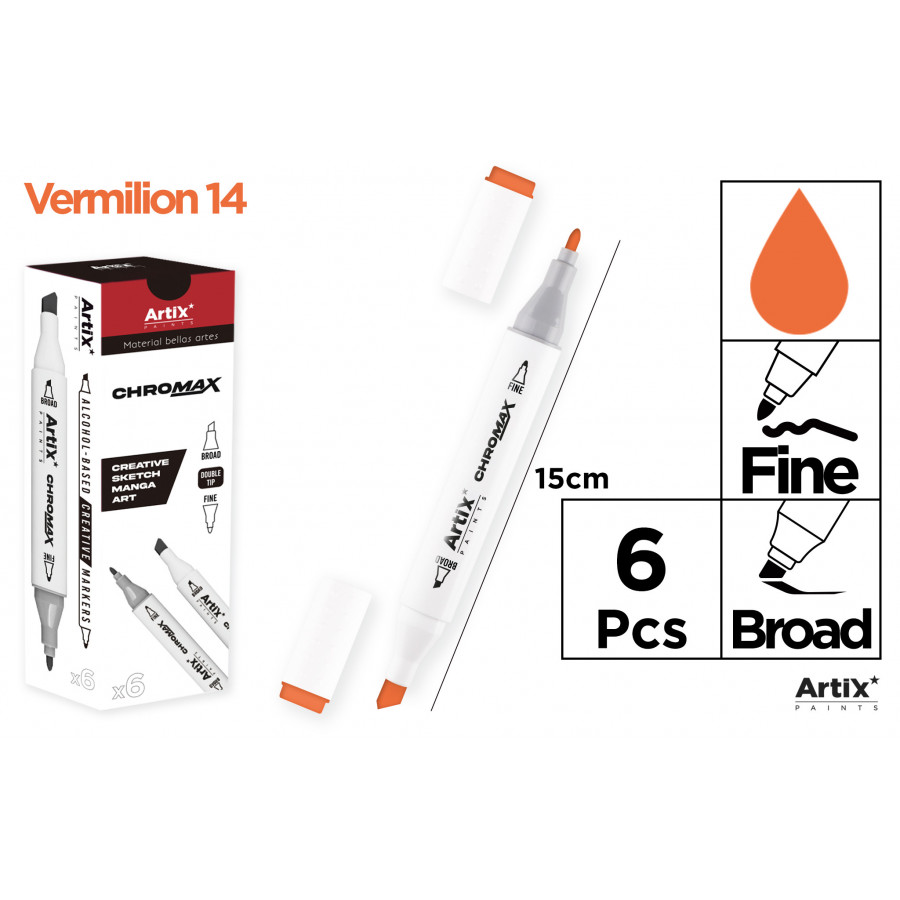 Marqueur créatif à double pointe et encre à base d'alcool. Corps en plastique. Pointe fine de 1 mm et pointe biseautée de 2 à 5 mm pour des lignes précises. Idéal pour réaliser des dessins créatifs, des croquis, des mangas, des bandes dessinées et toute création avec des marqueurs. Parfait pour les artistes amateurs, les designers et toute utilisation créative. Large gamme de couleurs pour créer n'importe quel design. Boîte de 6 unités. Couleur vermillon.