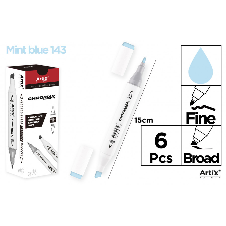 Marqueur créatif à double pointe et encre à base d'alcool. Corps en plastique. Pointe fine de 1 mm et pointe biseautée de 2 à 5 mm pour des lignes précises. Idéal pour réaliser des dessins créatifs, des croquis, des mangas, des bandes dessinées et toute création avec des marqueurs. Parfait pour les artistes amateurs, les designers et toute utilisation créative. Large gamme de couleurs pour créer n'importe quel design. Boîte de 6 unités. Couleur bleu menthe.