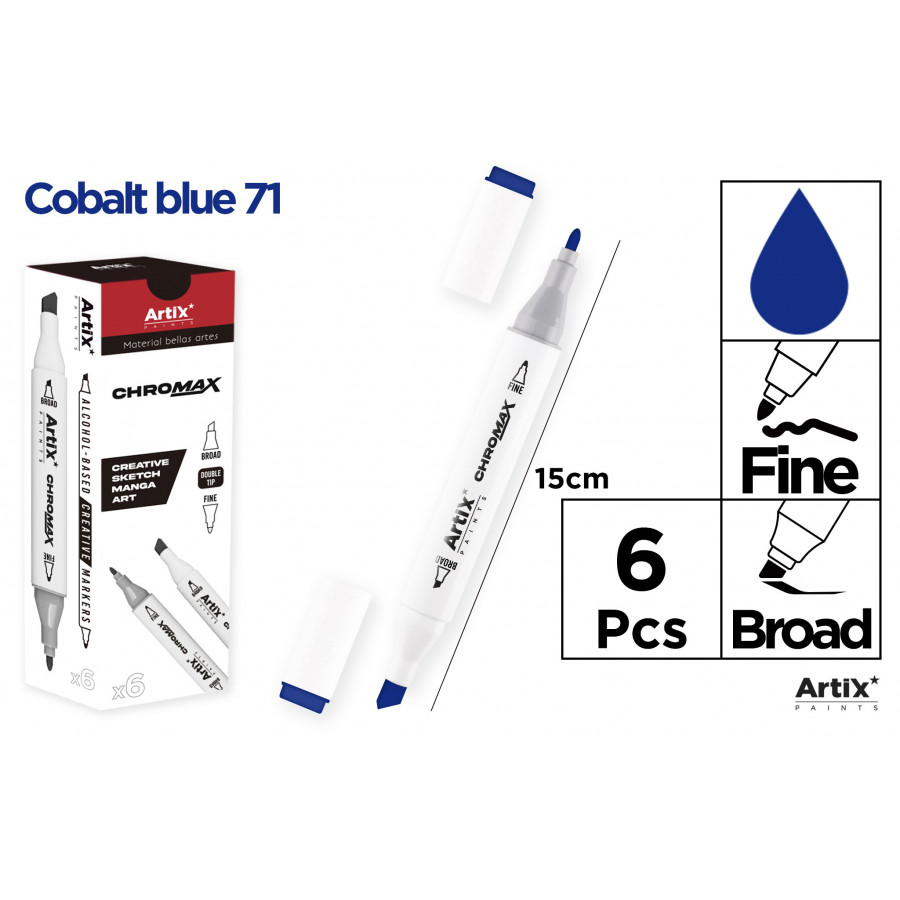 Marqueur créatif à double pointe et encre à base d'alcool. Corps en plastique. Pointe fine de 1 mm et pointe biseautée de 2 à 5 mm pour des lignes précises. Idéal pour réaliser des dessins créatifs, des croquis, des mangas, des bandes dessinées et toute création avec des marqueurs. Parfait pour les artistes amateurs, les designers et toute utilisation créative. Large gamme de couleurs pour créer n'importe quel design. Boîte de 6 unités. Couleur bleu cobalt.