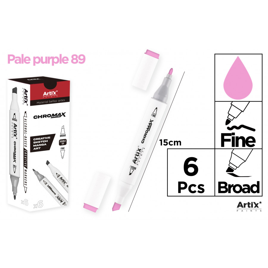 Marqueur créatif à double pointe et encre à base d'alcool. Corps en plastique. Pointe fine de 1 mm et pointe biseautée de 2 à 5 mm pour des lignes précises. Idéal pour réaliser des dessins créatifs, des croquis, des mangas, des bandes dessinées et toute création avec des marqueurs. Parfait pour les artistes amateurs, les designers et toute utilisation créative. Large gamme de couleurs pour créer n'importe quel design. Boîte de 6 unités. Violet pâle.
