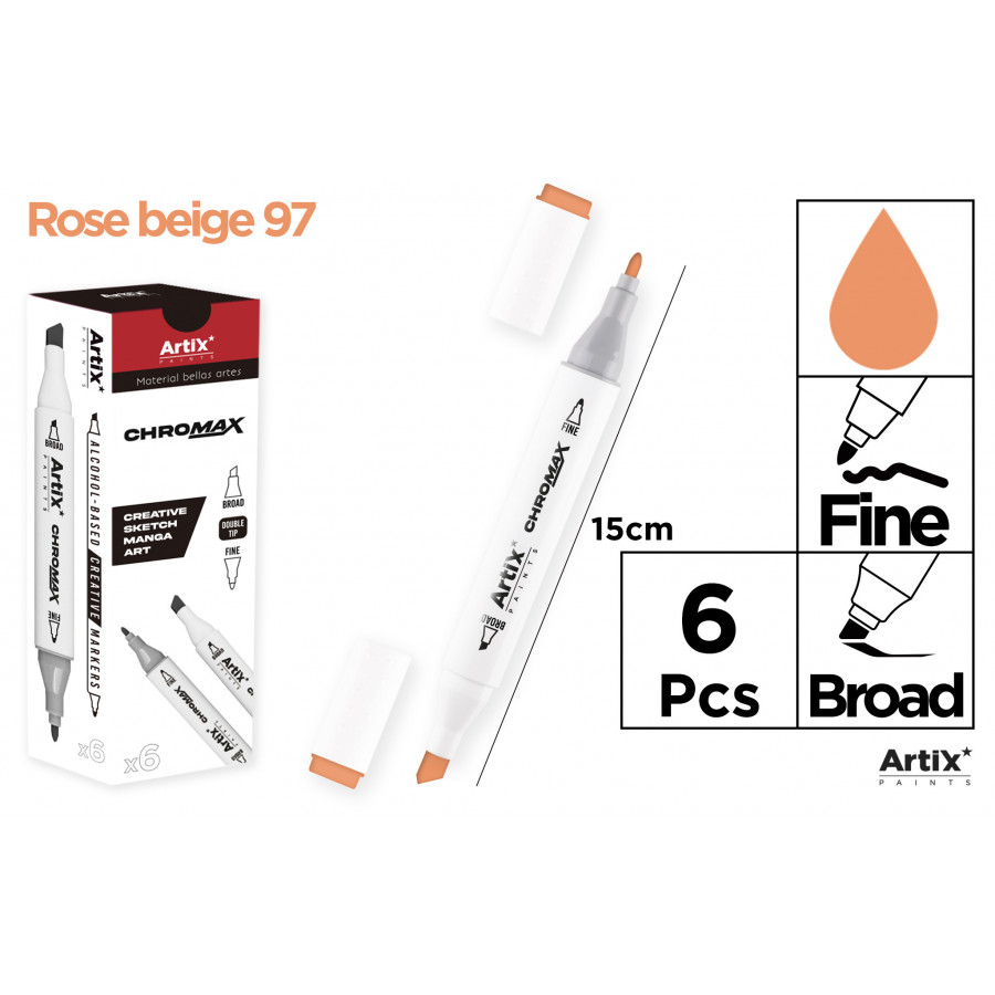Marqueur créatif à double pointe et encre à base d'alcool. Corps en plastique. Pointe fine de 1 mm et pointe biseautée de 2 à 5 mm pour des lignes précises. Idéal pour réaliser des dessins créatifs, des croquis, des mangas, des bandes dessinées et toute création avec des marqueurs. Parfait pour les artistes amateurs, les designers et toute utilisation créative. Large gamme de couleurs pour créer n'importe quel design. Boîte de 6 unités. Couleur beige rosé.