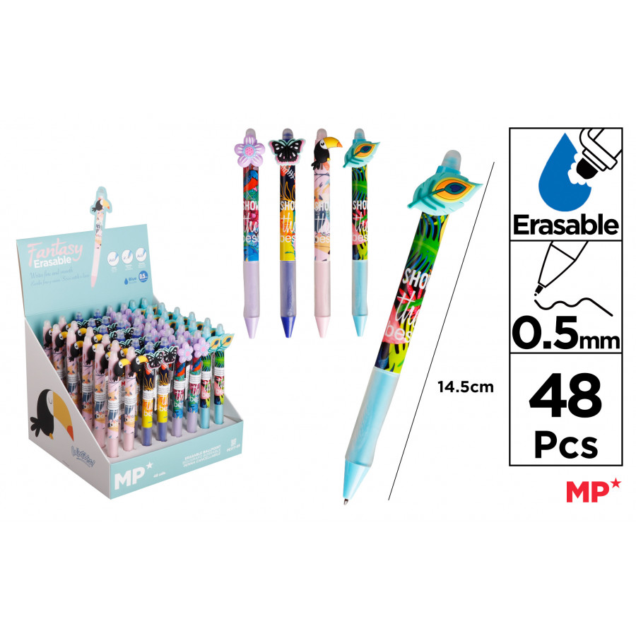 Stylo rétractable avec motifs de fantaisie, système à clic. Encre bleue effaçable par friction avec la gomme située à l'extrémité supérieure. En frottant, l'encre disparaît sans laisser de traces ou de taches sur le papier, permettant d'écrire rapidement à nouveau. Corps en plastique avec des designs amusants. Pointe de 0,5 mm. Taille : 145 mm. Designs assortis.