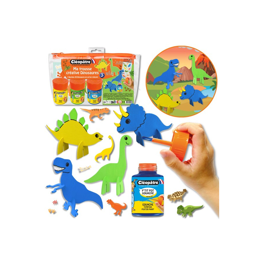 Un kit complet pour petits paléontologues : 4 figurines 3D Dinosaures à décorer avec gouache et gommettes, faciles à monter et à jouer avec. Développe créativité, motricité fine et imagination des enfants.