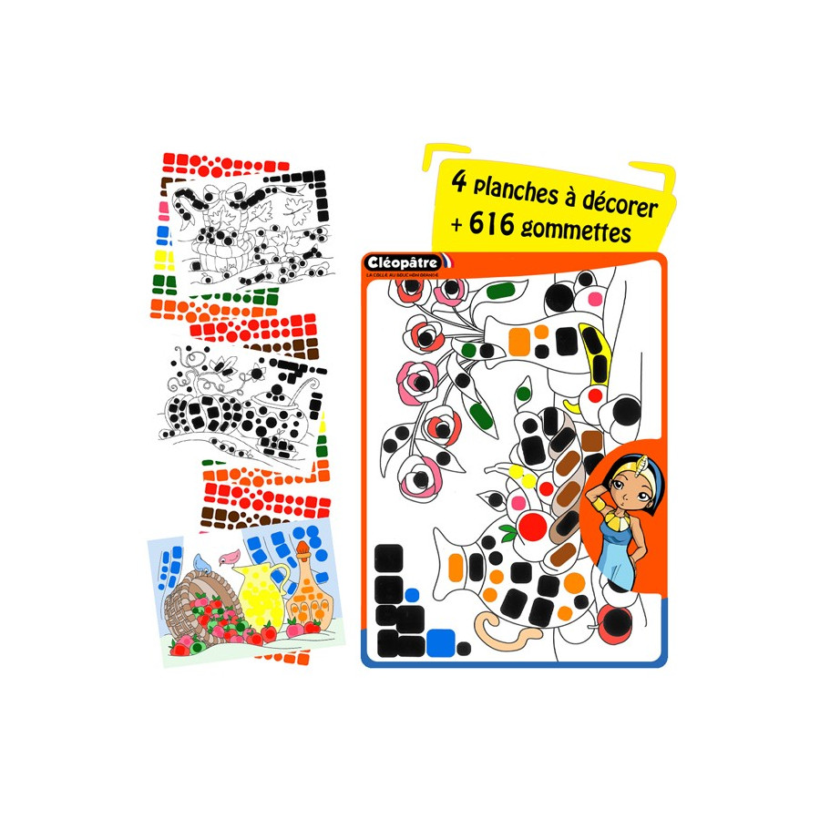 4 planches A4 de 154 gommettes géométriques détourées, de différentes formes et couleurs (rouge, rose, bleu, jaune, vert, orange).