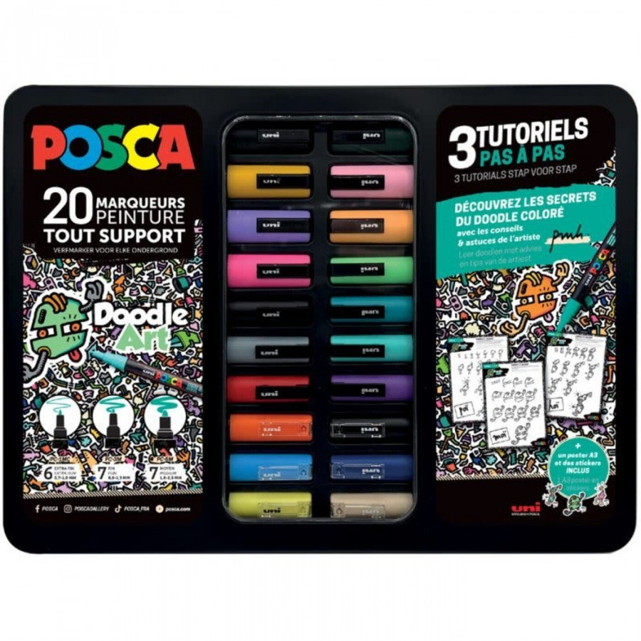 Exprimez votre créativité avec la mallette métal noire POSCA Doodle Art, un coffret complet conçu pour les artistes, créateurs et passionnés de dessin. Cette mallette moderne contient 20 marqueurs POSCA aux couleurs variées et aux trois tailles de pointe, pour un rendu précis et polyvalent sur de nombreux supports. Grâce à l'encre à base d'eau, vous pouvez dessiner, calligraphier, colorer et décorer sur papier, carton, bois, métal, verre et bien plus encore. Que vous soyez amateur ou professionnel, la variété des pointes - extra fine, fine et moyenne - permet de réaliser des tracés précis ou des aplats colorés, selon vos besoins et votre inspiration. Le coffret inclut également 3 tutoriels exclusifs de l'artiste PMH, pour vous guider et vous inspirer dans vos créations Doodle Art. Composition du coffret : Marqueurs pointe conique extra fine (PC1MC, 0,7 mm) : Bleu foncé, Ivoire, Jaune, Noir, Rose, Violet Marqueurs pointe conique fine (PC3M, 0,9-1,3 mm) : Abricot, Gris Ardoise, Lavande, Noir, Orange Foncé, Vert Émeraude, Vert Pomme Marqueurs pointe conique moyenne (PC5M, 1,8-2,5 mm) : Gris, Gris Profond, Noir, Orange, Ocre, Rose, Vert d'Eau Caractéristiques principales : Marqueurs POSCA authentiques Encre à base d'eau, opaque et résistante Trois tailles de pointe pour tracés fins, moyens ou larges Convient à toutes surfaces poreuses et non poreuses Coffret en métal noir pratique et robuste pour rangement et transport Inclus : 3 tutoriels Doodle Art de l'artiste PMH Applications idéales : Dessin, illustration et créations graphiques Calligraphie, coloriage et loisirs créatifs Customisation d'objets et décoration artistique Projets scolaires ou professionnels Cadeau parfait pour artistes et passionnés de couleurs