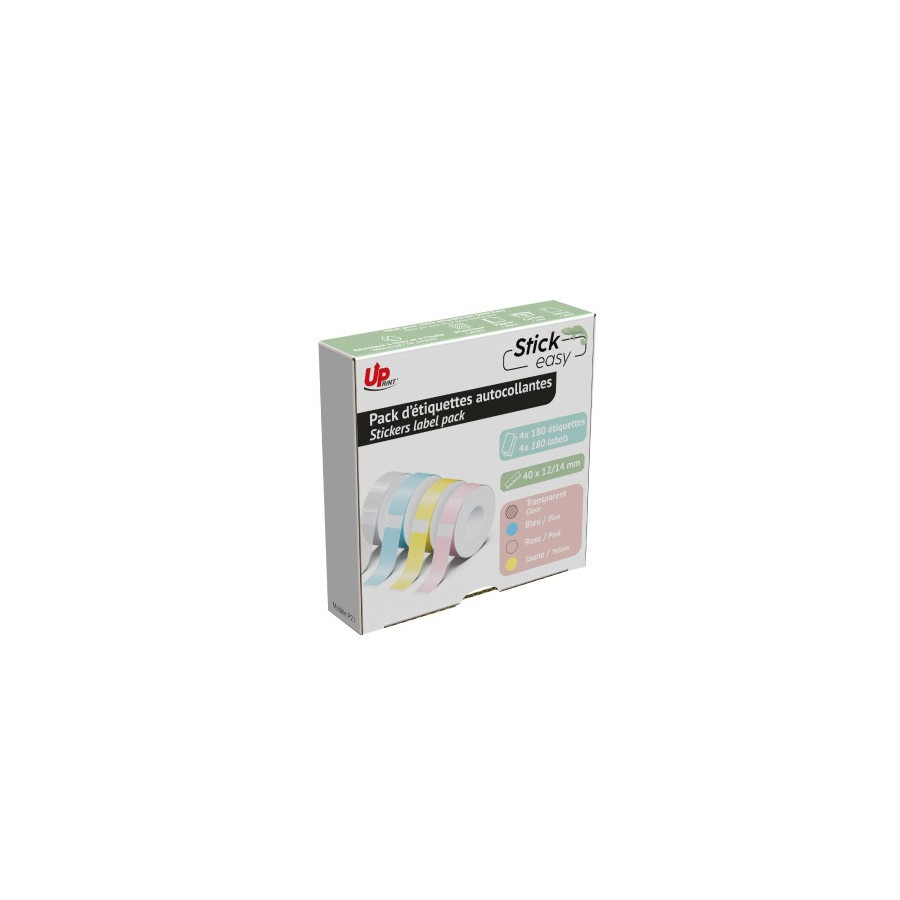 Le pack UPRINT Stick Easy UP21 – Pastel contient 4 rouleaux de 180 étiquettes chacun, au format 14 × 40 mm, offrant une grande variété de couleurs pour un étiquetage facile et ludique.